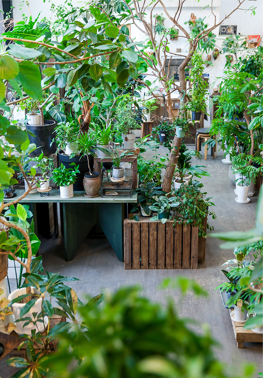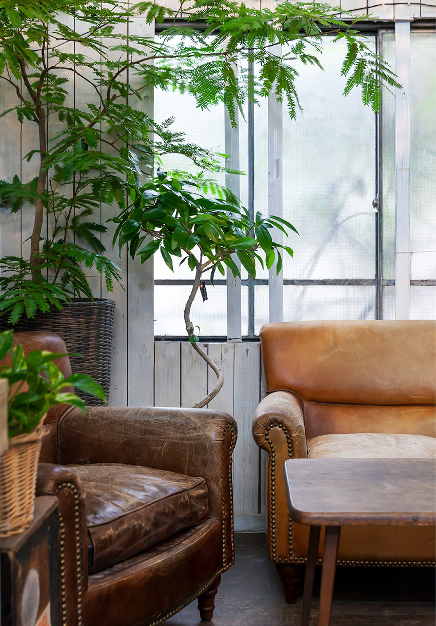 まるでジャングル?!階段を上ると現(xiàn)れる広々した空間は大きな溫室のよう。所狹しとグリーンが置かれ、BGMで流れる鳥の聲になんの違和感をもたないほど。どの鉢もつやつやと元気な葉がしげり、心地よさ満點の空間です。