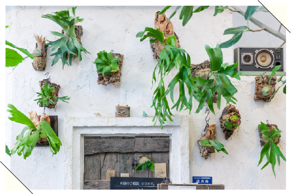 店には枝が木陰を作るように大きく伸びた大鉢がそこかしこに。沖縄の産地を訪ね、枝ぶりのいい植物を育てている農(nóng)家を探すなど、仕入れ先にもこだわっているのだとか。「木陰って気持ちいいですよね。部屋に置くときはその枝ぶりを生かしてください。たとえばソファの左手に、右に枝が伸びた鉢を置く。葉が少しかかるようにすると、心地よい空間ができますよ」