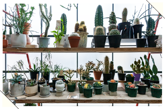 多肉植物やサボテンのコーナー。葉や莖、根に水分を溜め込む多肉植物はインテリアのアクセントとしても人気。