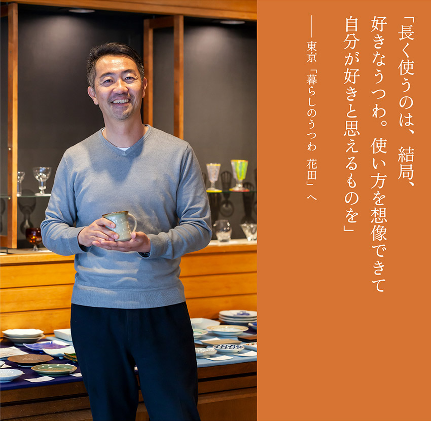 「暮らしのうつわ 花田」は1977年に開店、和食器を中心に作家の手づくりによるうつわを販売してきました。「食卓の中心は料理であり、人です。うつわはそのためのもの。僕たちのゴールはシンプルに『おいしく楽しく』。その助けになるうつわであればいいのかなと。楽しい時間が増えれば、人生も楽しくなるでしょう」と店主の松井英輔さん。