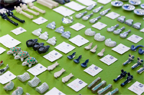 箸置きコーナーも充実。季節感やコーディネートのちょっとしたポイントに。ピロー代わりの細長いタイプ(寫真左上)も重寶しそう。