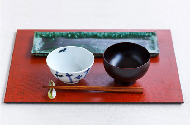 上の折敷の色変わり、赤地に黒を重ねたもの。「ちゃんとしたごはんというのは手間や時間をかけたお料理だけではなくて、設えることでもかなうもの。だから折敷はそんなに頑張らなかった日、忙しい日にこそ使われるといいと思います」。カレーなど洋の食事にも気軽に使って。「丸い大皿には少し変型した小鉢を合わせると動きが出ておいしそうに見えます」