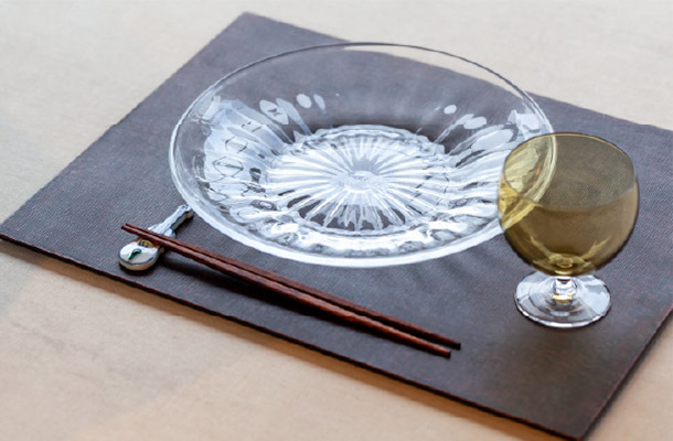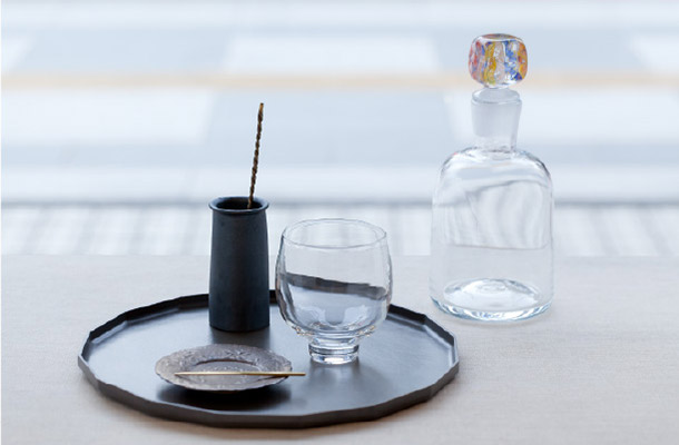 「乾漆の十六角の折敷。材質が紙なのでちょっと形を遊べるんですね。リビングのテーブル上でも折敷があると自分の演出ができて、気軽にいい時間がつくれると思います」。ガラスのレース模様の持ち手がきれいなボトルにウイスキーを入れて楽しんで。