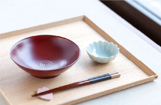 待ち遠しい春をひとあし早く食卓で。「漆の淺鉢にはちらしずしなどを盛るときれいですね。もちろん買ってきたものだっていいんですよ。花の小鉢、箸置きには桜の花びらを選んで春らしくしましょう。休日の晝ごはんがちょっと楽しい時間になります」