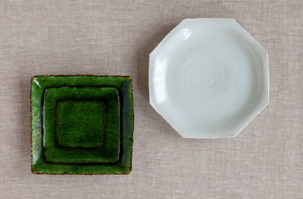 定番の、花田の「コレ」シリーズから。和洋を問わない中皿は手づくりのうつわ初心者にぴったり。左は織部の四方皿。和の印象がある織部も少しモダンな仕上げで日々活躍してくれそう。右は九谷特有のグレーがかった白磁で、30年ほどのロングセラー。「最初に選ぶお皿としておすすめしています。ろくろでひいているのでよく見るとうっすら跡が殘っています。八角が白のシンプルさにリズムを與え、食卓で豊かな表情になります。意外と毎日使ってしまううつわですね」