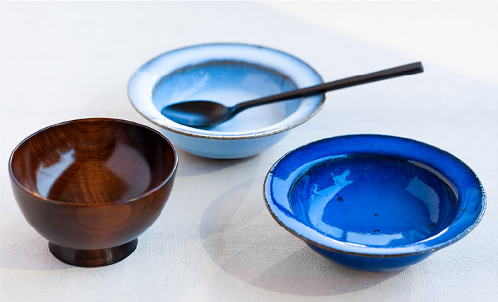 ブルーが美しい碗は人気作家の一人、瀧田 操さんのもの。リムの縁にごくわずかな返しをもたせ、すくいやすい形狀に。巖手の佐賀義之さんがつくる木目が美しい汁わんは大中小のサイズがあり幅広い年代に。