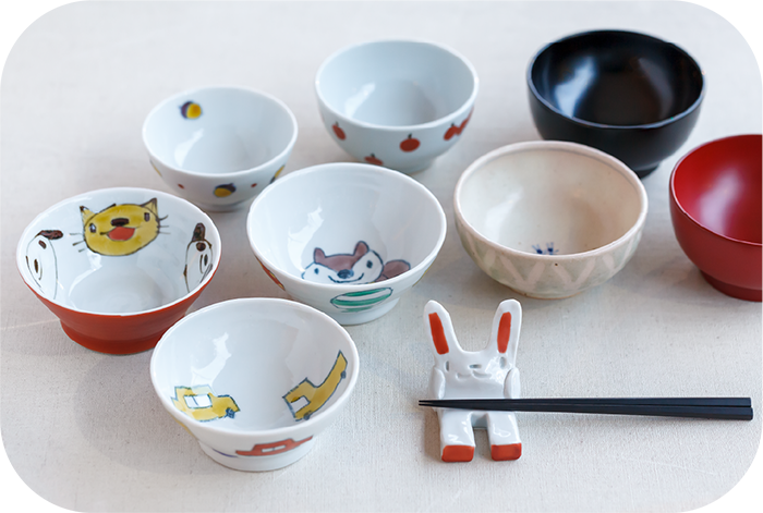 村田菜穂美ほか?子ども飯碗2,750円~3,520円、浄法寺?子ども椀各6,600円、石川漆寶堂?子ども五角箸3,410円、村田菜穂美?うさちゃんスプーンレスト1,650円ほか。