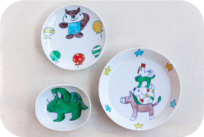 (左上から時計回りに)いずれも村田菜穂美?五寸皿 こりすちゃんバルーン 2,970円、20cmプレート ブレーメンの音楽隊 4,840円、楕円小鉢 トリケラトプス 2,750円。