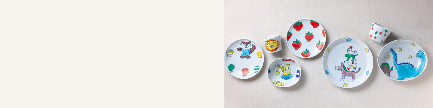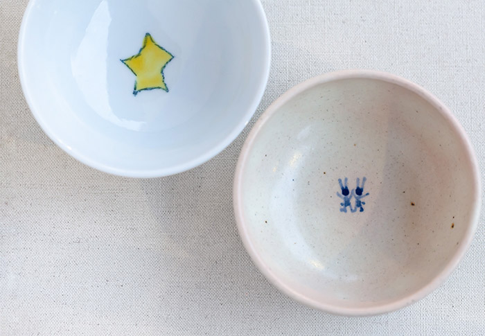 子ども用のうつわの特徴は、見込み部分に絵が多いこと。「最後まで食べたら、ごほうびで絵が現れる。だからごはんを殘さないようになる。殘さないで食べましたっていうゴールみたいなものですね」。小さなうさぎが1匹だったり、2匹だったり、消防車と一緒だったり…。少しずつ違っていて選ぶときもワクワクします。
