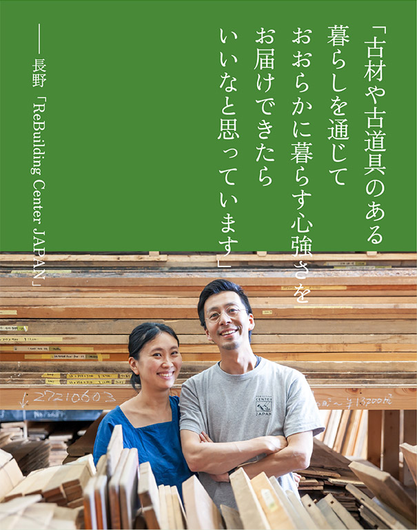 リビルディング センター ジャパンを誕生させた東野唯史さん、華南子さん夫妻。古材が並ぶ店內で。