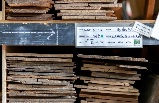 古材が並ぶ一角。レスキューした建物ごとに管理して販売。年代や場所も明記。「スペースを使うし管理の手間はかかりますが大切なことだと思ってます」