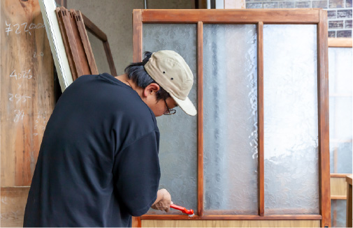 取材當日に運ばれてきた建具の掃除作業に遭遇。スタッフの皆さんの熱心な姿も印象的。