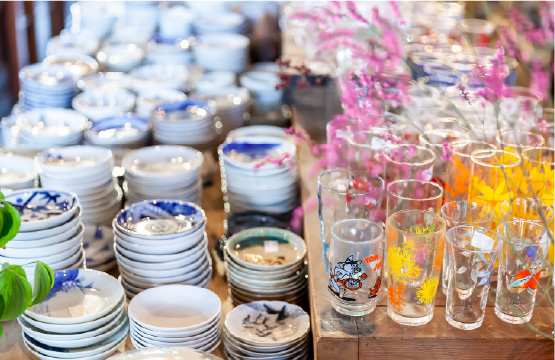 ガラスやうつわなど、レトロな食器もたくさん!寶物探しのような気分に。