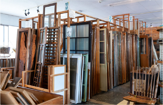 3階の建具売り場。窓枠やドア、古い型板ガラスなども。