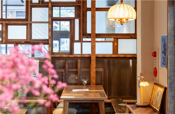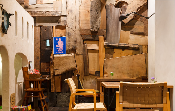 1階のカフェは、そんな古材を生かしたい人にヒントとなる空間。古材を使った手づくりのカウンターやテーブル、古い窓枠を使った壁や古材を貼り合わせた壁など取り入れ方の參考になりそうなアイデアも。さまざまな古材が混在していても、ホッと落ち著ける空間になっています。