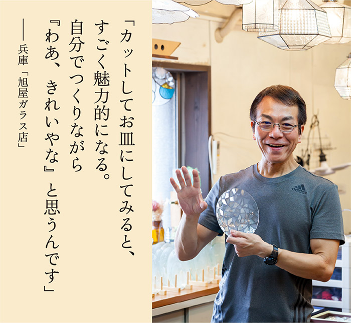 2002年に脫サラして家業を継いだ古舘さんは、新しい分野に挑戦しようとステンドグラスの修業を積み、技術を會得。殘された昭和型板ガラスでランプシェードをつくることを思い立ちます。その後、熱を加えれば皿にできると思いつき、試行錯誤の末に商品化。それがコロナ禍に人々の目にとまり、一躍人気商品となりました。