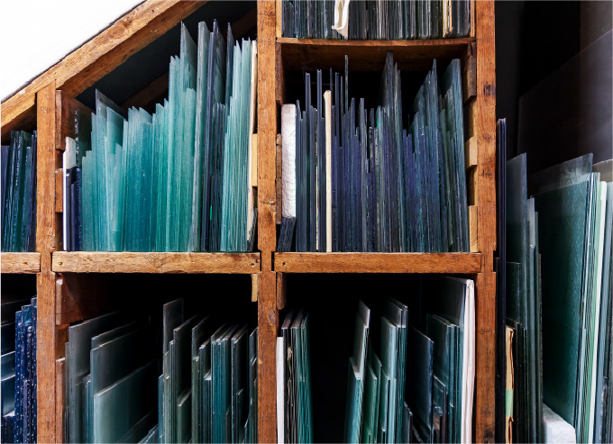 工房に置かれた大きさもさまざまな昭和型板ガラス。當時は破損時の張り替え用にストックしていたという。