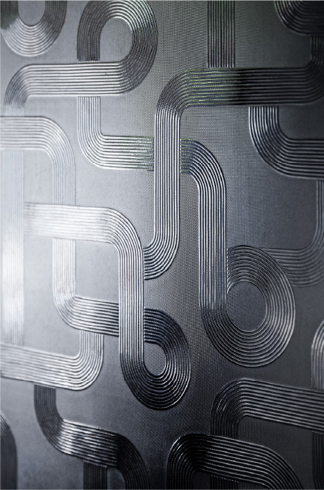 昭和型板ガラスは、つるりとしたガラス面と柄が入った面があるのが特徴。それぞれに名前がつけられ、上はぐるぐると曲線が描かれた「サーキット」、下は大膽な曲線がユニークな「わかば」。