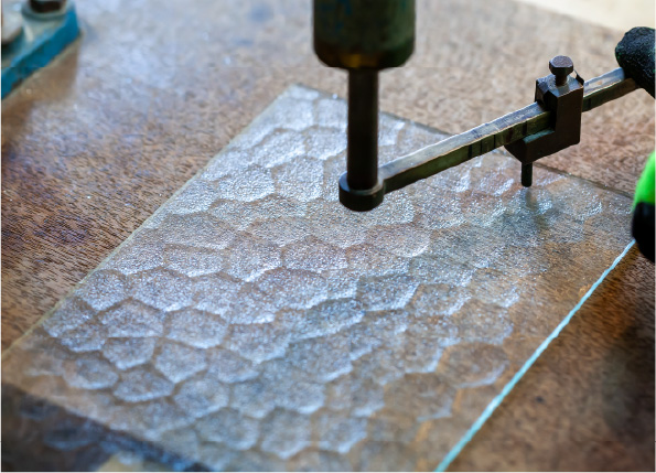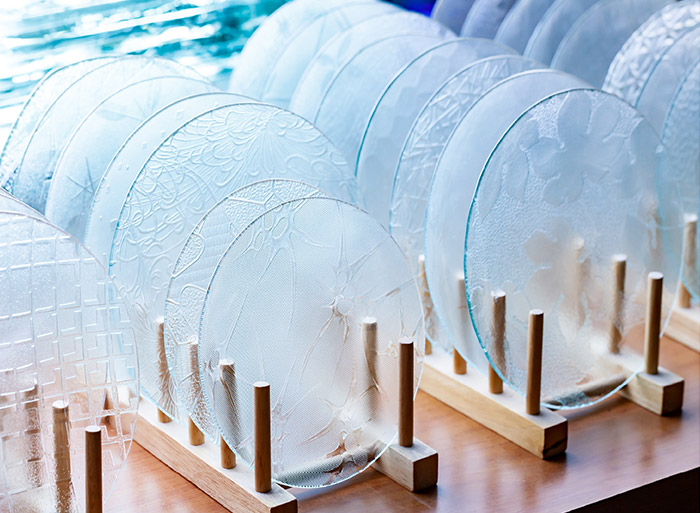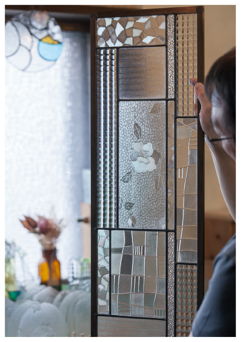 そして昭和型板ガラスの魅力はなんといっても70種類ほどもあるという多様な柄。「海外だとテクスチャーの種類はあっても、ここまで多様な柄はほぼない。自然や草花などモチーフもバラエティー豊かで日本獨特のデザインだと思いますね。だから自分でつくりながら、『わあ、きれいやな』と、たえずそう思いながらつくってます(笑)」