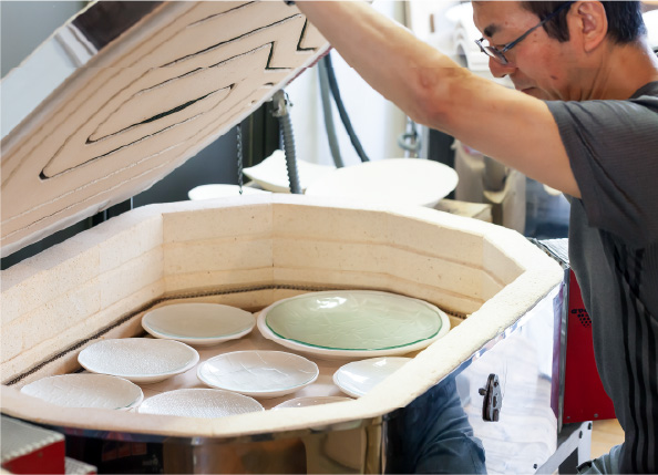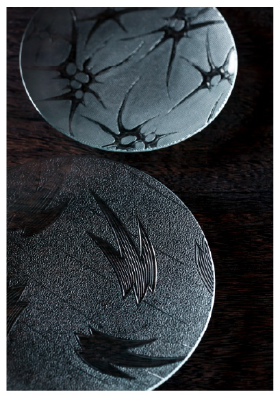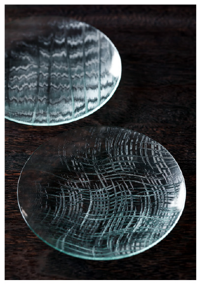 繊細な柄を生かすため、どうしても皿にしたかったという古舘さん。成型のために熱を加えると、肝心の柄が溶けてしまうという難題を、こまめな溫度調節をすることでクリア。実験を重ねながら、皿狀になり、縁の切り口も溶けてテカリが出て、かつ、きちんと柄が殘る溫度域を見つけ出しました。