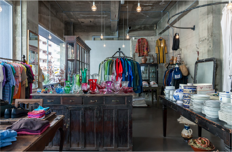 洋服や雑貨が並ぶ店內(nèi)。什器もビンテージの家具を使い、心地よい空間に。