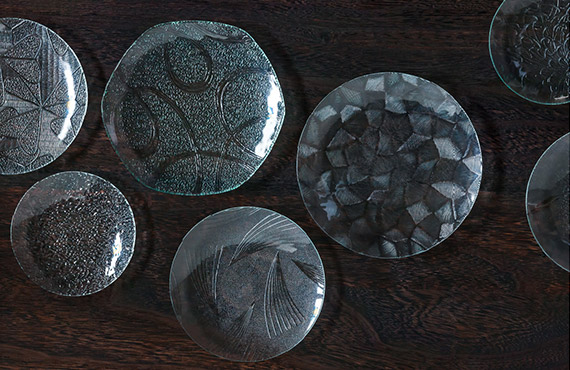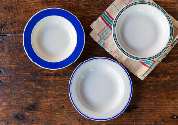 使いやすいシンプルな皿。左上から時(shí)計(jì)回りにイタリア、オランダ、オーストリアのもの、各2,500円、皿の下のクロス1,900円。