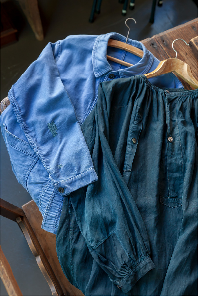 美しいリペアが特徴的なワークウエア。(左)フランスのモールスキンワークジャケット。袖の継ぎも丁寧に施されている。ジャケット17,900円。(右)1920?30年代のアンティークものも!手縫いのボタンホール、インディゴリネンの継ぎも素?cái)场%ぅ螗钎%触辚庭螗攻猊氓?9,900円。