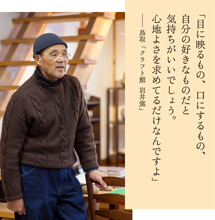巖井窯は1971年、山本教行さんが22歳で開いた窯元です。鳥取の民藝運動の中心人物であった醫師?吉田璋也と出會い、師事したのが16歳のとき。高校3年のときには、來日したバーナード?リーチに會いたい一心でヒッチハイクで東京まで行き、知己を得たそう。坂村真民に會いに愛媛?松山を訪れ、偶然の導きで自宅に招き入れられたことも。あふれる情熱と行動力、そんな山本さんが生涯を通じて見つめているのは、好きからつながる自分らしい暮らしです。