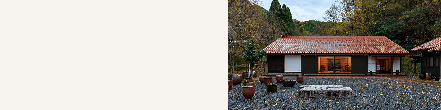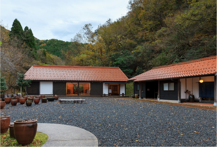 谷川のせせらぎを耳にしながら門扉をくぐり、詩人?書家の坂村真民による陶板に迎えられてエントランスへの坂道を上ると、広々した中庭が現れます。蓮が植えられた甕が心地よく配され、中央には大きな石。それを見守るように數棟の建物や窯が並び、すっきりとした心地よい雰囲気に包まれます。