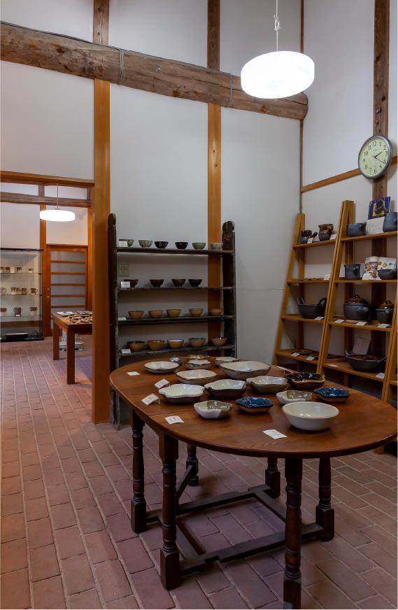 工房に併設された作品展示室。喫茶HANAのランチで使われているうつわや箸置きなども。