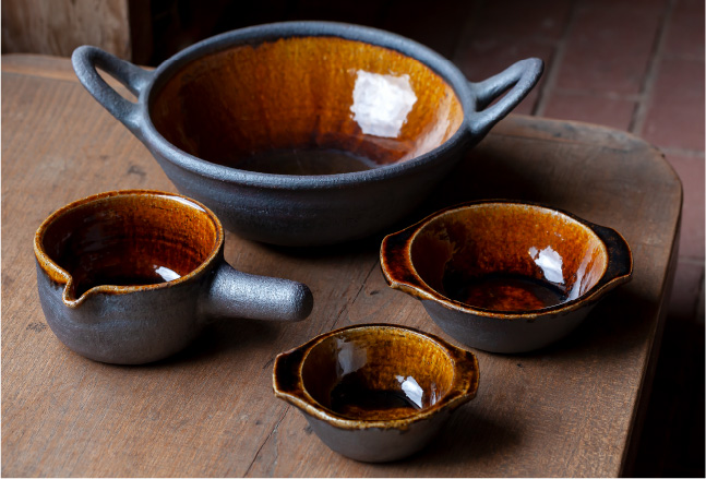 上から時計回りに両手付平土鍋33,000円、耳付土鍋6寸7,700円、耳付土鍋4寸5,500円、ミルク沸かしピッチャー丸形13,200円、いずれも山本教行作品。