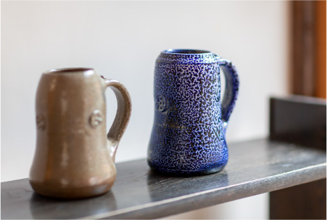掻き落としがアクセントのポットと、思わずこれで飲んでみたい! と思わせるビアマグも。
