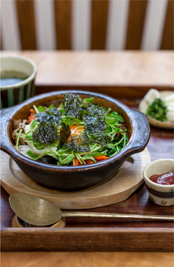 喫茶HANAの看板料理。ごま油を引いた土鍋にごはんを入れて、ひき肉、たっぷりの野菜ナムル、キムチ、目玉焼きをのせて香ばしく焼き上げます。熱々、パリパリのお焦げもおいしい!