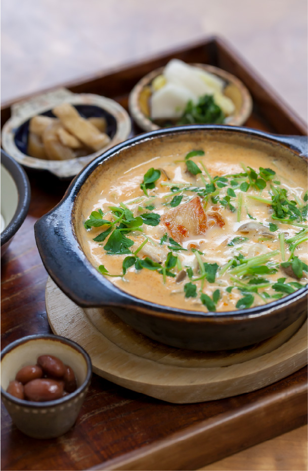 寒い季節の人気メニューの一つ。チゲスープにミルクとチーズを加えた韓國風リゾット。コクのあるミルクととろけたチーズでまろやかな、優しい味わいに。蓄熱するのでずっと溫かいまま食べられるのも土鍋ならではです。