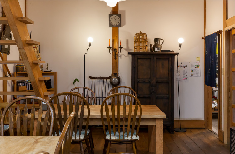 喫茶HANAの店內は山本教行さんが好きだと思うものだけが置かれています。ベンチは25歳のときに自身でつくって使っていたもの。松本民蕓家具の椅子やLOFTで購入したスタンドランプ、骨董店で見つけた時計…新舊のさまざまなものが違和感なく整えられた、心地よい空間になっています。