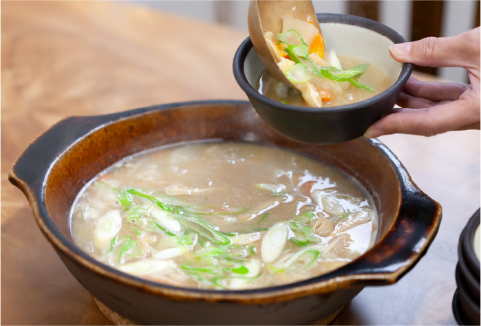 特別に山本家の食卓の定番もご紹介! かす汁は耳付土鍋(9寸)で。吟醸の酒かすをほんのりと味噌と合わせるのが山本家の味。「冬は普通に鍋料理に使いますし、肉じゃがなどの煮物もいい感じに仕上がりますよ」と房江さん。