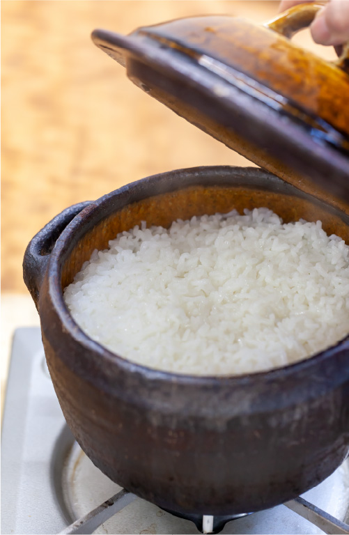 土鍋シリーズの蓋付片手土鍋は炊飯にも重寶、短時間でふっくらおいしいごはんが炊き上がります。「たまに子どもさんが店に來られますが、家ではあまり食べないのに、ここのごはんはよく食べるんですと言われるお母さんがいらっしゃいますね」