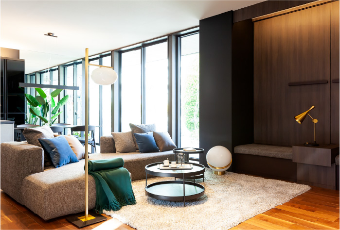 上からだけでなく橫からの光を取り入れると、落ち著いた雰囲気に。また、その時々に必要なスペースだけに明かりを點燈することで省エネにも。