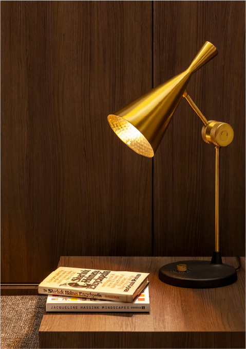 部屋全體が明るくなくても、手元をしっかり照らすことで意外に不便は感じないもの。また、音楽を聴くなど手元を明るくする必要がないときは、シェードの角度を変えて壁を照らすなど、間接照明のように使うことで雰囲気のある空間をつくることができます。