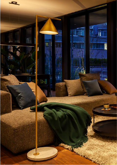 ここではテーブルスタンドに加えて、背の高いフロアスタンド、さらに大きめのテーブルスタンドを床置きにして組み合わせました。ゴールドの素材感をポイントに選ぶことで空間にもまとまりが生まれます。