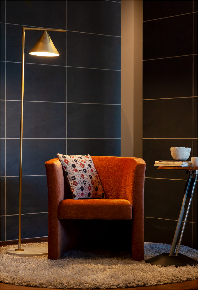 フロアスタンドとラウンジチェアを組み合わせて、くつろぎのコーナーを演出。やわらかな光に包まれた小さな空間です。