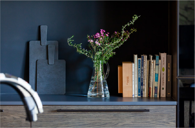 レシピ本が並ぶ、食器棚の一角に花を飾って。ハーブのローズマリーで清々しい香りも楽しめる。