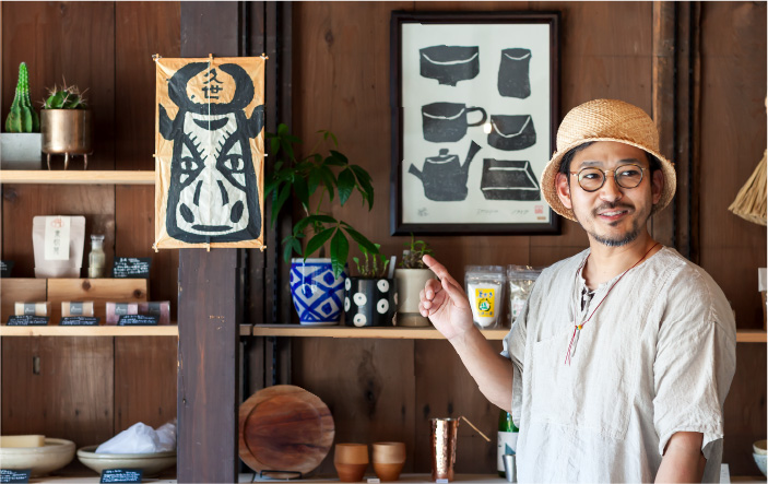 中に入ると、土間や畳の間にずらりとものが並んで圧巻。焼き物や雑貨、かご、洋服、民蕓品、本…とさまざま。目に飛び込むあれこれに、好奇心が止まりません。「その凧が牛なのは…」と説明してくれるのは店主のヨコヤマアツシさん。鹿児島のセレクトショップに勤めた後、岡山へUターン。実家の旅館の隣、築98年の古民家を改修して店を開きました。店名は、かつて山で暮らしていたとされる人々から。「箕(み)をつくったり川魚を取ったり、山を移動しながら暮らしていた。そんな暮らし方が、旅と手仕事をコンセプトにした店に合うなと思ったんです」