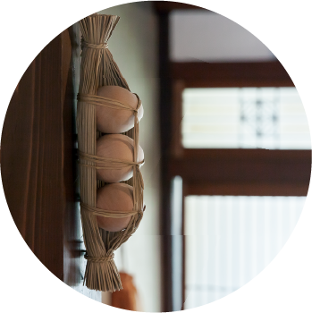 柱にかけられていたのは、倉敷市?須波亨商店の卵を運ぶときのわらづと?4,400円。木製の卵を入れてオブジェに。