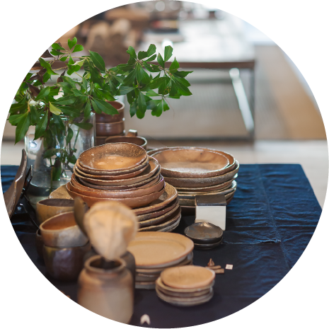 ざっくりと積まれた備前焼などの器は若手作家のもの。使いやすいサイズで一枚一枚表情を見ながら選びたい。
