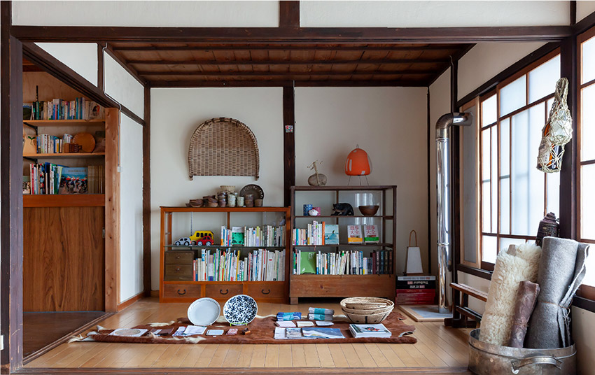 喫茶スペースもある2階の本棚には本がずらり。古い箕(み)や熊の置物なども違和感なく置かれ、帰省した実家にいるような気分に。