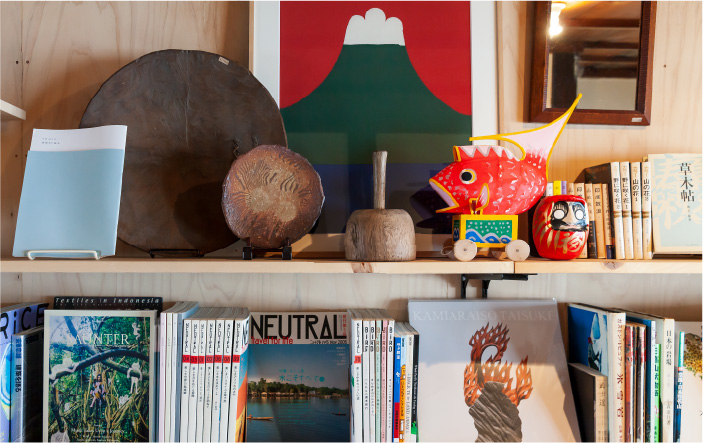 雑誌や國內外のZINEも。棚に飾られた雑貨にも、ついつい目がいく。