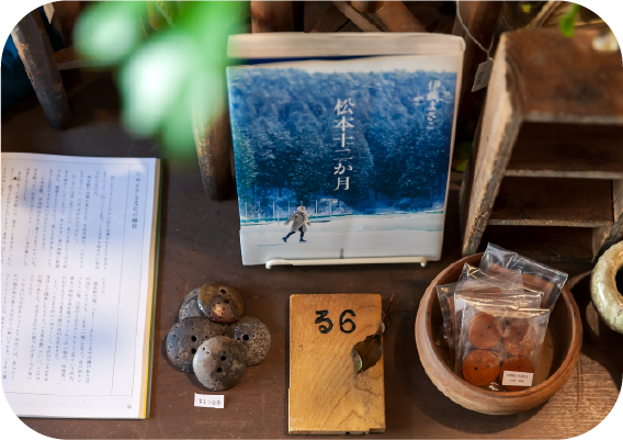 ボタンに、げた箱の札に、本がさりげなく。本もディスプレーの一つとして飾られている。