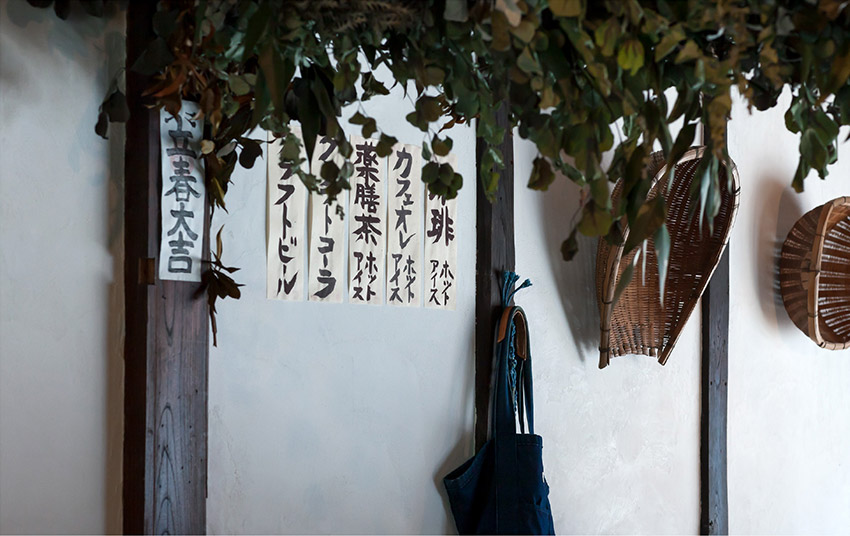 寫真手前、い草ののれんがかけられた店。のれんは倉敷市?須波亨商店でつくられたもの。開放的な間口は、壁を取り払い、古いガラス戸を6枚はめ込んだそう。