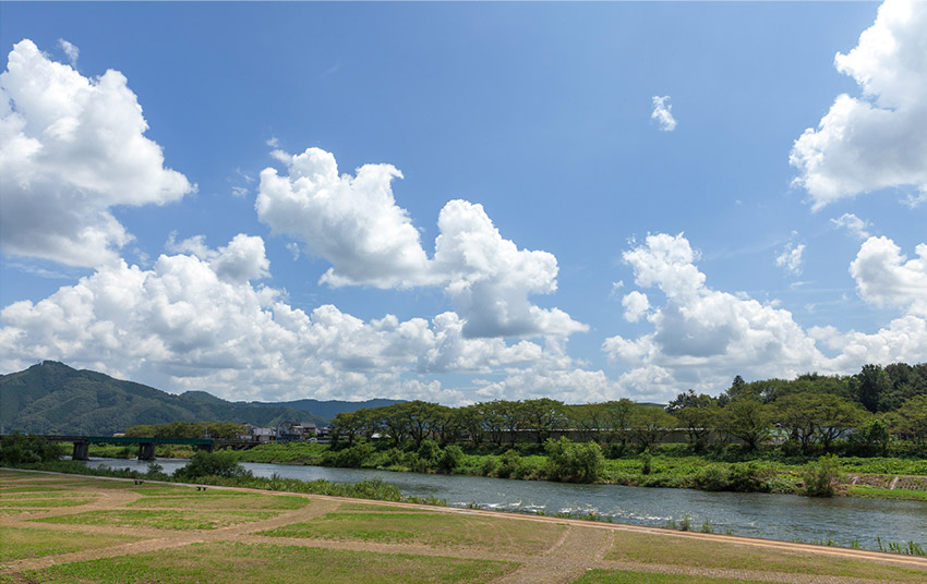 店の前の細道を抜けると、急に視界が広がり旭川ののどかな風景が広がっていました。かつて出雲街道と大山道の交差した久世の町は、牛の市で栄え、旭川には物資を岡山へ運ぶ船著き場があったといいます?!干介g部だからこそ見られる四季折々の自然や昔ながらの風景が魅力です」